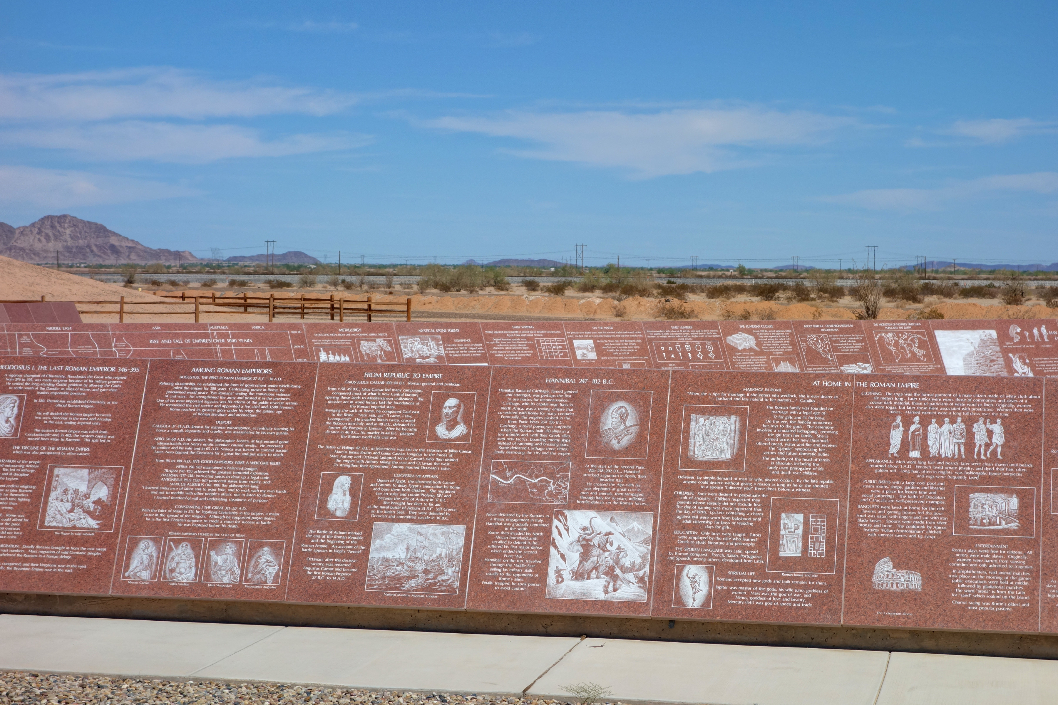 Monuments are usually made of granite, and here are many hundreds of feet of it, long pink slabs of polished granite with the history of the world engraved for the ages, in text and illustrations, laid out like a crystal ball atop an hourglass. That’s what it looks like, at least, from space.